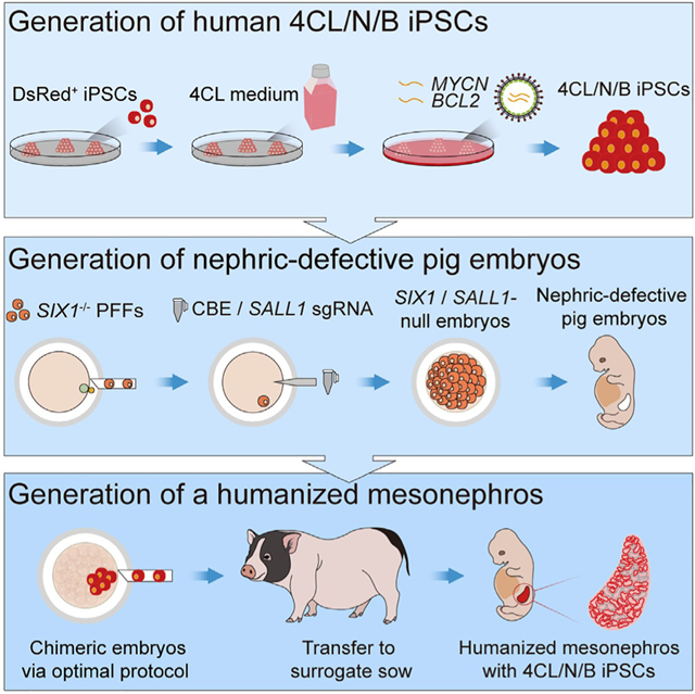 在研究中,研究人員利用具有高分化潛能、強(qiáng)競(jìng)爭(zhēng)及抗凋亡能力的新型人誘導(dǎo)多能干細(xì)胞,結(jié)合優(yōu)化的胚胎補(bǔ)償技術(shù)體系,在腎臟缺陷豬模型體內(nèi)實(shí)現(xiàn)了人源化中腎的異種體內(nèi)再生,這是世界范圍內(nèi)首次報(bào)道的人源化器官異種體內(nèi)再生案例。