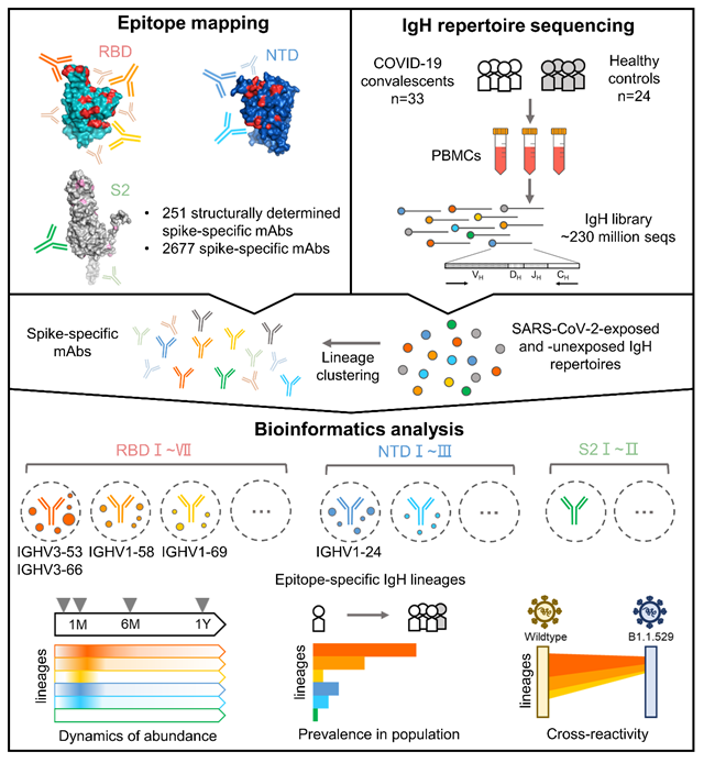 靶向新冠病毒(SARS-CoV-2)刺突蛋白(Spike)的中和抗體是保護性體液免疫的關(guān)鍵組成部分,全面剖析SARS-CoV-2感染誘導的中和抗體庫的組成對于疫苗設計和評價具有重要科學意義。此前該領域的研究主要基于傳統(tǒng)的血清學和細胞生物學方法,為疫苗的設計和改進提供了重要理論基礎。而在Spike整體水平或在亞結(jié)構(gòu)域(RBD、NTD 或 S2)水平上分析特異性抗體反應,無法區(qū)分靶向特定表位的抗體組成。雖然此前有研究嘗試使用優(yōu)化的血清學方法利用線性肽來繪制SARS-CoV-2刺突蛋白不同表位抗體譜,然而這些方法僅適用于研究線性表位,無法表征靶向構(gòu)象表位的抗體。為了克服上述障礙,我們使用高通量免疫球蛋白測序(IR-seq)來分析抗體組庫,為SARS-CoV-2感染后的系統(tǒng)B細胞反應應答機理提供獨特的視角(http://51lmsc.cn/xwdt/kydt/202202/t20220224_6372075.html)。在本研究中,團隊通過將IR-seq與結(jié)構(gòu)生物學和生物信息學相結(jié)合,建立了一種分析IR-seq抗體助學分析方法。分析了靶向SARS-CoV-2刺突蛋白上特定中和表位的抗體譜系的豐度和人群共享度的 定量關(guān)系(圖1)。基于該方法,研究人員首先利用252個已解析結(jié)構(gòu)的Spike特異性人源單克隆抗體,繪制了識別Spike的中和表位譜。研究發(fā)現(xiàn)中和抗體的識別位點與刺突蛋白受體結(jié)合域(RBD)上的突變熱點之間高度重疊,提示中和抗體對RBD的強選擇壓力。