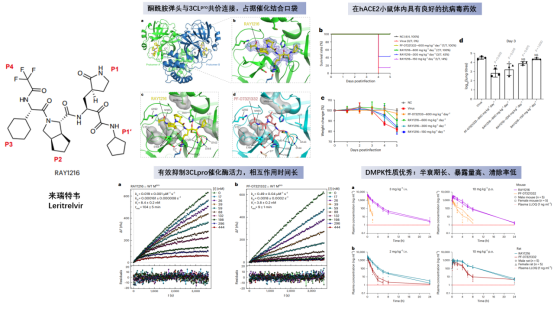 研究團隊還在大鼠和小鼠模型上進行了來瑞特韋的藥代動力學測試,在口服灌注或注射且不聯用利托納韋的情況下,實驗結果證明RAY1216具有優(yōu)秀的藥代動力學性質。RAY1216在體內的藥物血漿暴露量高于對照藥物PF-07321332,體內清除率低,代謝半衰期長,其優(yōu)秀的藥代動力學性質表現為其在臨床上的單藥使用提供了有力的科學證據。