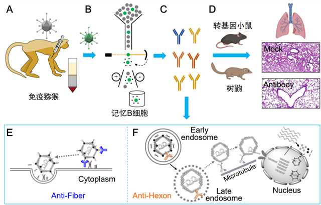 圖1:A. 候選疫苗免疫獼猴;B. 利用熒光標(biāo)記病毒篩選特異性記憶B細(xì)胞;C. 篩選中和單抗;D. 中和單抗體內(nèi)保護(hù)效果評(píng)估;E. Fiber單抗阻斷病毒與細(xì)胞受體結(jié)合;F. Hexon單抗阻斷病毒的內(nèi)體逃逸。