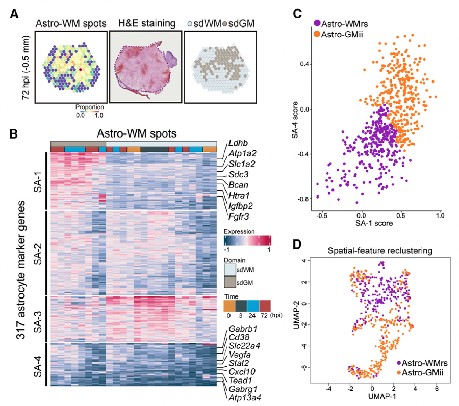 研究人員通過整合空間轉(zhuǎn)錄組數(shù)據(jù)和已有的SCI單細(xì)胞/單核測序數(shù)據(jù)對Astro-GMii細(xì)胞的分子特征進(jìn)行了多水平、多維度的分析,從中鑒定出可以標(biāo)記Astro-GMii并在SCI后特異性上調(diào)的特征基因之一Igfbp2。值得一提的是,通過空間轉(zhuǎn)錄組識別出某種特定細(xì)胞亞型或亞群后,可以對其位置信息進(jìn)行分子特征提取,獲得“位置指紋”。用這些位置指紋可以對已發(fā)表的單細(xì)胞數(shù)據(jù)進(jìn)行空間特征注釋和虛擬細(xì)胞分選(virtual cell?sorting)。例如,利用Astro-GMii的位置指紋對第三方發(fā)表的SCI單細(xì)胞數(shù)據(jù)進(jìn)行比對和分析,研究人員也鑒別到Astro-GMii亞群并利用這些數(shù)據(jù)進(jìn)一步分析了該亞群的分子演化過程,充分體現(xiàn)了空間位置特征這一維度對發(fā)掘細(xì)胞功能異質(zhì)性的重要作用(圖4)。