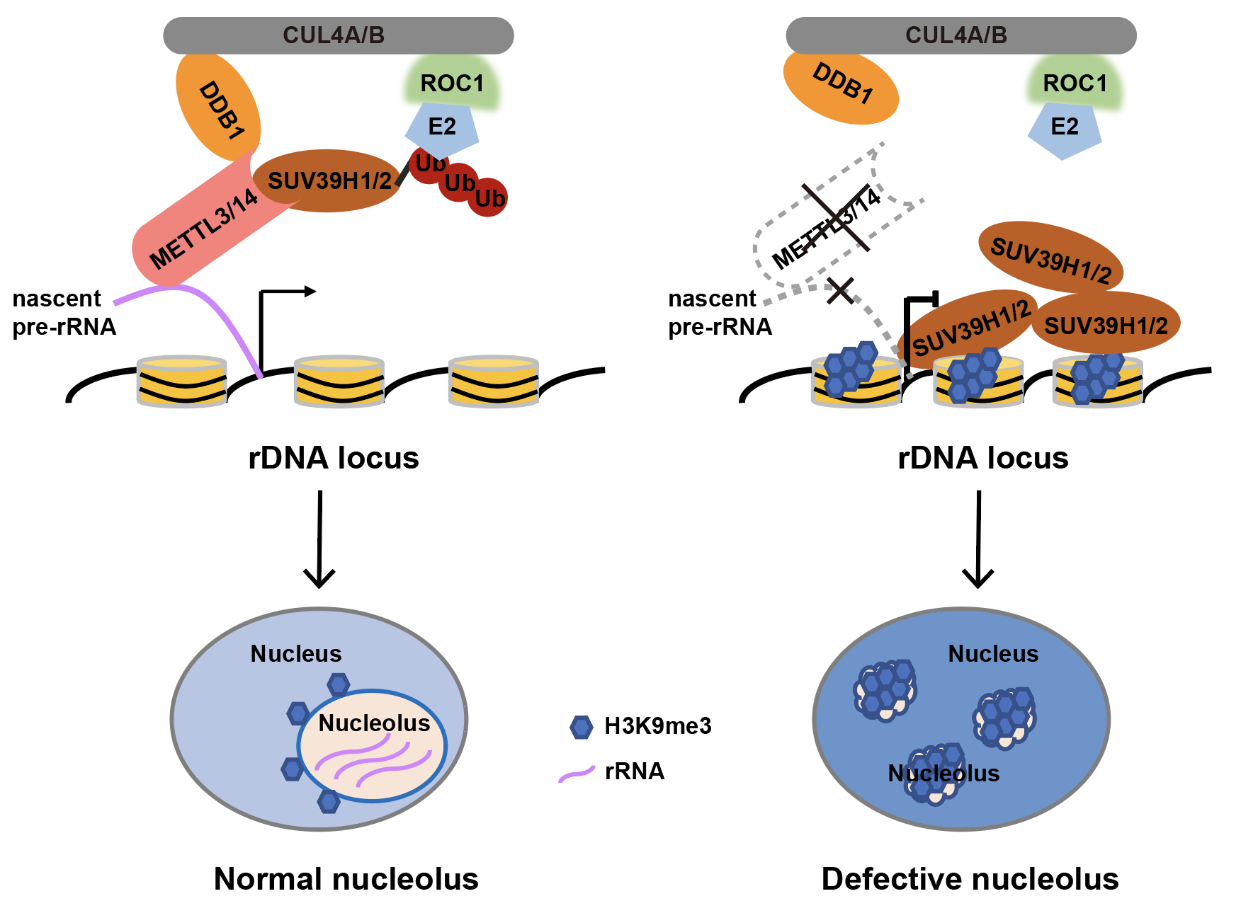 此項研究發(fā)現(xiàn)在人胚胎干細胞中敲除METTL3或METTL14后,并沒有導(dǎo)致傳統(tǒng)認為的mRNA變化,而是引起核仁結(jié)構(gòu)和功能的劇烈異常,包括核仁變小、數(shù)目異常增多、rRNA合成減少、核糖體裝配障礙、核仁功能異常導(dǎo)致的核仁應(yīng)激導(dǎo)致的細胞生長停滯等。進一步發(fā)現(xiàn),缺失METTL3或METTL14后,徹底破壞了核仁的液-液相分離,從而核仁不能形成完整且規(guī)則的由多種大分子相分離形成的正常多層級聚集體結(jié)構(gòu)。隨后,研究發(fā)現(xiàn)在METTL3/METTL14缺陷的細胞中,H3K9me3甲基轉(zhuǎn)移酶SUV39H1/H2蛋白顯著升高,導(dǎo)致H3K9me3在整個核仁中積累和浸潤,并損害LLPS。從機制上說,METTL3/METTL14復(fù)合物作為CRL4 E3泛素連接酶的必要接頭,靶向SUV39H1/H2并促進其多泛素化和蛋白酶體降解,從而阻止H3K9me3在核仁中的積累,并維持其正常的LLPS和結(jié)構(gòu)。