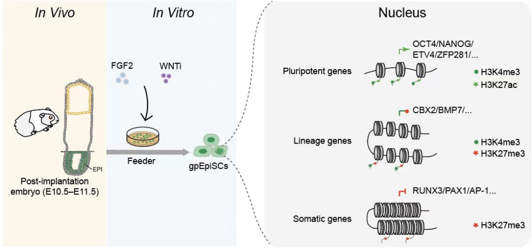在該項(xiàng)研究中,研究團(tuán)隊(duì)從豚鼠植入后胚胎中成功分離培養(yǎng)出始發(fā)態(tài)多能干細(xì)胞系gpEpiSCs。這些細(xì)胞系在優(yōu)化后的培養(yǎng)基中能穩(wěn)定傳代并維持多能性,表達(dá)OCT4、SOX2和NANOG等關(guān)鍵多能性標(biāo)志物,能夠形成具有三個(gè)胚層細(xì)胞類型的畸胎瘤,核型穩(wěn)定。在信號(hào)調(diào)控上,F(xiàn)GF2、ACTIVIN A和WNT信號(hào)通路在維持gpEpiSCs多能性和抑制分化中起關(guān)鍵作用。對(duì)轉(zhuǎn)錄組和表觀遺傳組測(cè)序分析顯示,gpEpiSCs在與人類和嚙齒動(dòng)物的始發(fā)態(tài)多能干細(xì)胞高度相似的同時(shí)也表現(xiàn)出獨(dú)特的基因表達(dá)譜,提供了新的物種特異性多能機(jī)制見(jiàn)解。