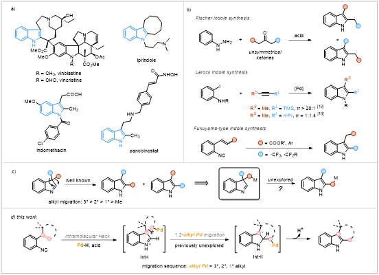2,3-二烷基吲哚廣泛存在于各類天然產(chǎn)物及生物活性藥物分子當(dāng)中。然而,在眾多的吲哚合成方法中,相較于芳基取代的吲哚,區(qū)域選擇性合成2,3-二烷基吲哚則要困難得多。例如,經(jīng)典的Fisher吲哚合成在使用非對(duì)稱的酮作為底物時(shí),常面臨區(qū)域選擇性的問(wèn)題,導(dǎo)致產(chǎn)物難以分離。Larock吲哚合成雖然在一定程度上解決了區(qū)域選擇性的問(wèn)題,但僅限于炔烴兩端的取代基位阻差異較大的情況下,并會(huì)使位阻較大的取代基保持在吲哚的C-2位。Fukuyama-type吲哚合成由自由基啟動(dòng),可區(qū)域選擇性構(gòu)建2,3-二烷基吲哚,但自由基前體的種類往往較為局限。因此開發(fā)新型的2,3-二烷基吲哚的區(qū)域選擇性合成方法仍然十分迫切。