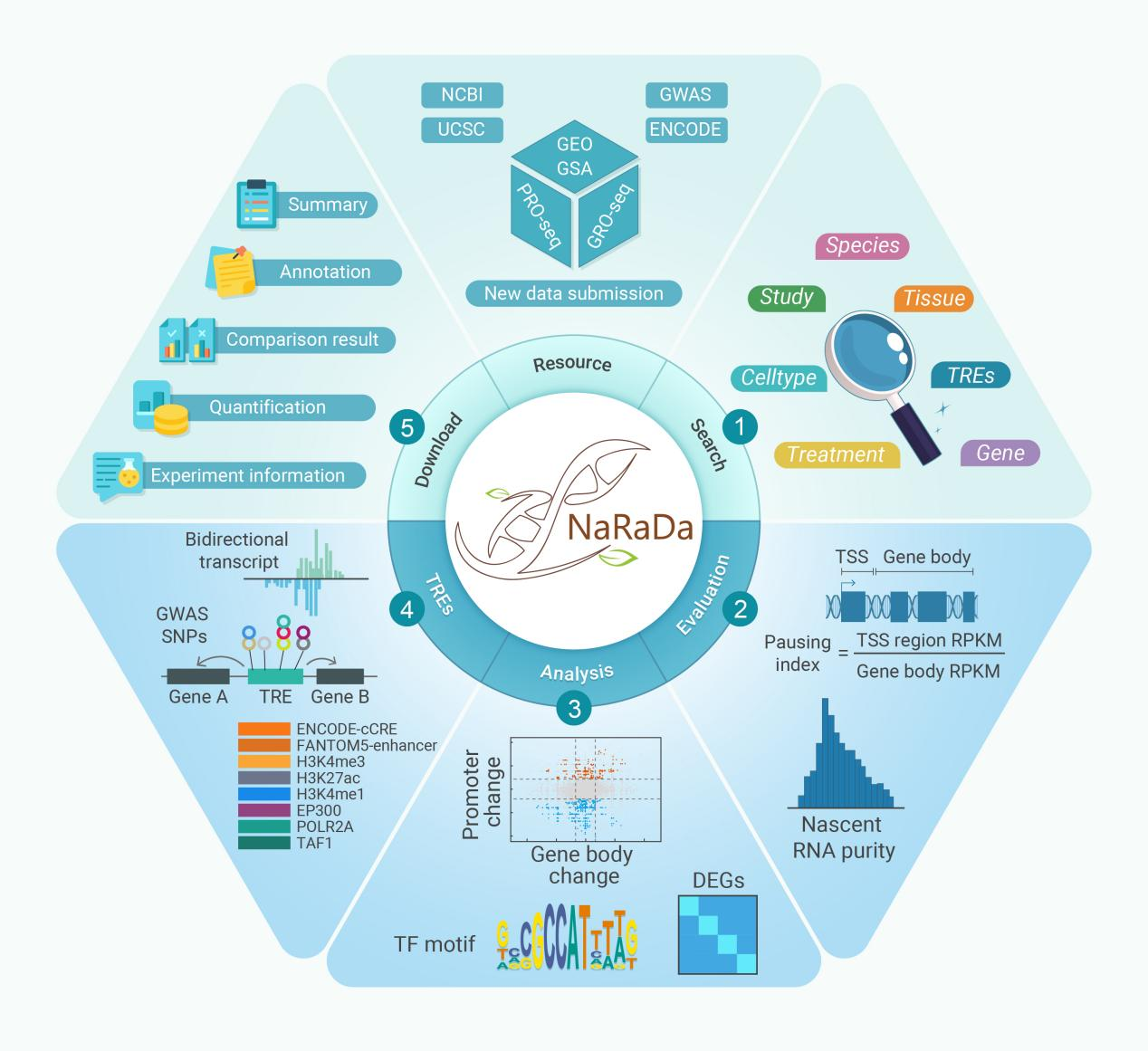近日,中國科學院廣州生物醫(yī)藥與健康研究院鮑習琛團隊在The Innovation Life發(fā)表了題為“NaRaDa: A comprehensive nascent RNA database”的文章,構(gòu)建了綜合性的新生RNA數(shù)據(jù)庫NaRaDa(http://www.narada.bio)。