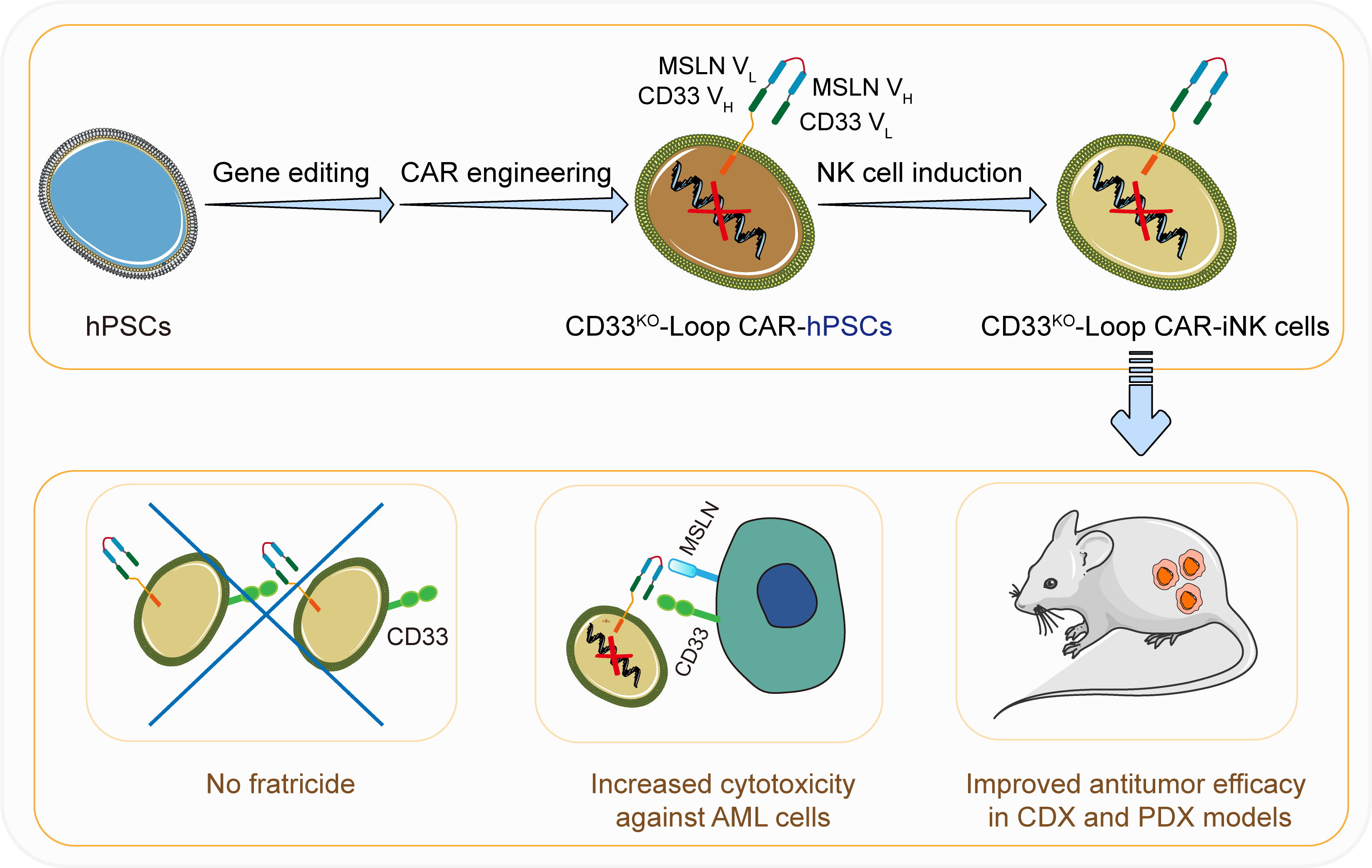 近日,中國科學(xué)院廣州生物醫(yī)藥與健康研究院(以下簡稱“廣州健康院”)血液譜系再生研究組在Journal for ImmunoTherapy of Cancer雜志在線發(fā)表了題為“CD33KO-CD33-mesothelin loop CAR design avoids fratricide and improves efficacy of iNK cells against acute myeloid leukemia”的研究論文。該研究針對間皮素(MSLN)和CD33靶點(diǎn)雙陽性的急性髓系白血?。ˋML)設(shè)計(jì)了環(huán)形雙靶點(diǎn)嵌合抗原受體(CD33-MSLN Loop CAR,Loop CAR),并基于臍帶血NK細(xì)胞(UCB-NK)或人多能干細(xì)胞(hPSCs)誘導(dǎo)的NK(iNK)細(xì)胞制備出Loop?CAR-NK或Loop?CAR-iNK細(xì)胞。Loop?CAR-NK細(xì)胞能夠有效殺傷AML細(xì)胞。研究還進(jìn)一步通過在hPSCs中敲除CD33基因解決了Loop?CAR-iNK細(xì)胞因靶向自身CD33抗原分子而引起的“自相殘殺”問題。該研究為AML細(xì)胞治療新策略提供理論和技術(shù)依據(jù)。