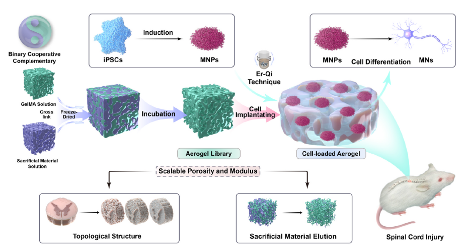 中國科學(xué)院廣州生物醫(yī)藥與健康研究院(以下簡稱“廣州健康院”)納米轉(zhuǎn)化醫(yī)學(xué)研究組和華中科技大學(xué)協(xié)和醫(yī)院孫家明教授團隊近期聯(lián)合在 Materials Today Bio發(fā)表了題為 “Aerogel library with varying porous structures and mechanics regulates motor neuron progenitor differentiation for spinal cord injury repair” 的研究論文。該研究構(gòu)建了一種微納結(jié)構(gòu)與力學(xué)性能可調(diào)控的多孔氣凝膠庫,揭示了仿生三維微環(huán)境的孔隙結(jié)構(gòu)與力學(xué)強度對人源誘導(dǎo)多能干細胞(hiPSCs)來源的運動神經(jīng)前體細胞(MNPs)譜系命運調(diào)控作用和關(guān)鍵分子機制,并驗證了其在脊髓損傷修復(fù)中的功能再生潛力。