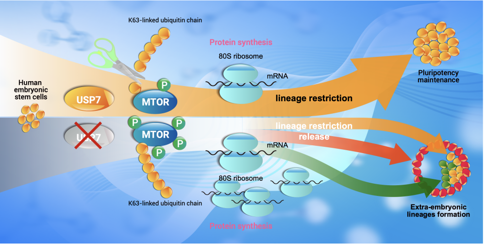近期,中國科學(xué)院廣州生物醫(yī)藥與健康研究院發(fā)表了題為“USP7 restricts lineage potency in human embryonic stem cells through modulating mTOR activity”的研究論文。該研究揭示了一種限制人多能干細(xì)胞發(fā)育潛能的關(guān)鍵因子——去泛素化酶USP7,并闡釋其通過去除mTOR 蛋白上非經(jīng)典K63多泛素化修飾,從而調(diào)控 mTOR 活性的全新機(jī)制。