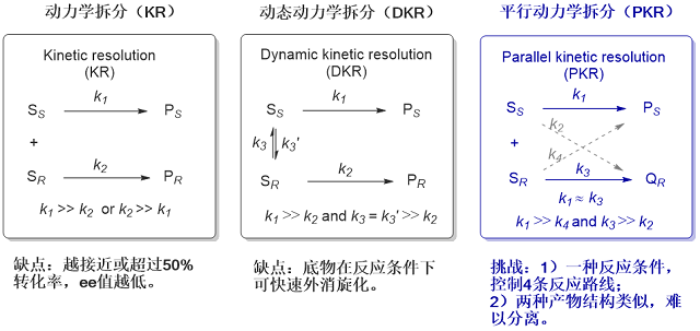 獲得手性化合物的單一對(duì)映異構(gòu)體最常見的途徑是對(duì)非手性底物的不對(duì)稱催化轉(zhuǎn)化,對(duì)映選擇性地產(chǎn)生手性因素。另一種主要途徑是把已經(jīng)含有手性因素的外消旋體混合物轉(zhuǎn)化為單一的對(duì)映異構(gòu)體產(chǎn)物。這一途徑可以通過以下三種策略實(shí)現(xiàn):動(dòng)力學(xué)拆分(KR);動(dòng)態(tài)動(dòng)力學(xué)拆分(DKR);和平行動(dòng)力學(xué)拆分(PKR)。KR是利用兩種對(duì)映異構(gòu)體底物在同一個(gè)不對(duì)稱催化條件下轉(zhuǎn)化為產(chǎn)物的速率不同(k1 >> k2 或 k2 >> k1),最理想的情況是50%的一種構(gòu)型的底物完全轉(zhuǎn)化為單一構(gòu)型的產(chǎn)物,而50%的另一種構(gòu)型的底物完全不反應(yīng)且能被回收。事實(shí)上隨著反應(yīng)的進(jìn)行,“劣勢(shì)”構(gòu)型反應(yīng)底物的相對(duì)濃度不斷增加,它也會(huì)參與反應(yīng),導(dǎo)致“有害”構(gòu)型的產(chǎn)物生成,從而降低產(chǎn)物的對(duì)映選擇性。而DKR策略有效克服了KR的缺點(diǎn),即不斷富集的“劣勢(shì)”構(gòu)型反應(yīng)底物可以不斷地發(fā)生消旋化,部分轉(zhuǎn)化為“優(yōu)勢(shì)”底物,進(jìn)而不斷地生成目標(biāo)構(gòu)型的產(chǎn)物。理想情況下,外消旋體底物可以通過DKR可以100%轉(zhuǎn)化為單一構(gòu)型的產(chǎn)物,但是前提是兩種構(gòu)型的底物在反應(yīng)條件下可以快速互變(k1 >> k2 且 k3 >> k2)。為了克服KR和DKR的固有限制, Vedejs和Chen于1997年引入了另一種叫做平行動(dòng)力學(xué)拆分(PKR)的策略,即兩種對(duì)映體底物分別沿兩條不同的反應(yīng)路徑,以相同或接近的速率轉(zhuǎn)化 (k1≈k3且k1 >> k4 且 k3>> k2),得到單一對(duì)映異構(gòu)體的兩種產(chǎn)物。在一種不對(duì)稱反應(yīng)條件下,既要實(shí)現(xiàn)化學(xué)選擇性又要實(shí)現(xiàn)對(duì)映選擇性調(diào)控,即兩種底物兩種產(chǎn)物四條反應(yīng)路線的調(diào)控是一個(gè)巨大的挑戰(zhàn)。PKR策略的另一個(gè)挑戰(zhàn)是,所得到的兩種產(chǎn)物一般結(jié)構(gòu)類似,從而造成產(chǎn)物分離非常困難,因此實(shí)用性好的PKR反應(yīng)并不多見(圖1)。