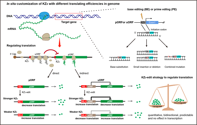 因此,該研究基于對(duì)編碼基因Kozak序列的精確操作,提出了一種名為KZ3-edit的新型基因表達(dá)調(diào)控策略:利用精準(zhǔn)基因編輯技術(shù)在DNA水平上精確修飾起始密碼子上游的3個(gè)核苷酸(這是Kozak序列的一部分,堿基偏好最顯著,被命名為KZ3),這足以高效調(diào)控基因的翻譯效率。在不改變基因的轉(zhuǎn)錄水平和蛋白質(zhì)序列的情況下,對(duì)mRNA的翻譯水平進(jìn)行定量和雙向調(diào)控,從而將蛋白表達(dá)精細(xì)地控制在預(yù)期的水平。通過體外雙熒光報(bào)告系統(tǒng)、綠色熒光細(xì)胞系及內(nèi)源基因三個(gè)層面,研究人員驗(yàn)證了KZ3-edit策略的有效性和靈活性,并證實(shí)通過精準(zhǔn)基因編輯工具對(duì)基因主效開放閱讀框(Primary Open Reading Frame, pORF)或uORF起始密碼子上游KZ3序列的單個(gè)堿基改變或堿基組合轉(zhuǎn)變,可以實(shí)現(xiàn)特定基因翻譯水平的高效調(diào)控。