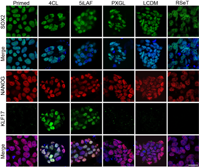 圖1.不同培養(yǎng)條件下猴胚胎干細(xì)胞中SOX2,NANOG和KLF17的免疫熒光
