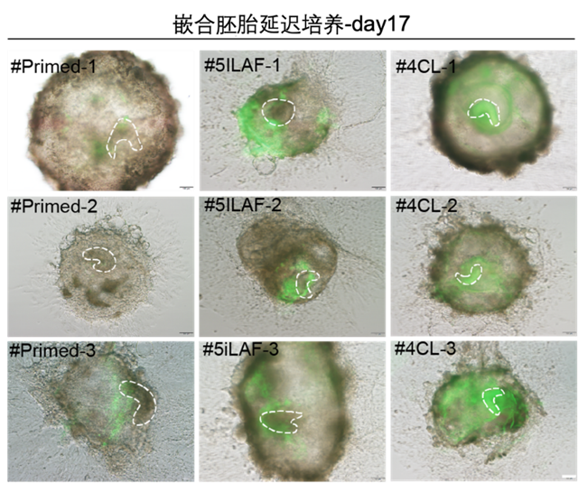 胚胎干細(xì)胞注射入受體胚胎后的快速凋亡是影響胚胎干細(xì)胞成功嵌合的關(guān)鍵。研究團隊選用綠色熒光蛋白標(biāo)記的4CL條件下的胚胎干細(xì)胞進行猴胚胎注射實驗,通過測試干細(xì)胞注射入胚胎后的不同培養(yǎng)基和培養(yǎng)時間的組合,最終得到了既不影響胚胎正常發(fā)育又能保證干細(xì)胞存活的最優(yōu)嵌合胚胎培養(yǎng)條件。而且5iLAF和Primed體系下的胚胎干細(xì)胞在該優(yōu)化條件下也表現(xiàn)出胚胎注射后的高存活率。將注射了4CL和5iLAF干細(xì)胞的嵌合胚胎分別在體外延遲培養(yǎng)到第17天,發(fā)現(xiàn)注射的胚胎干細(xì)胞仍然可以高效存活,單細(xì)胞測序 表明猴胚胎干細(xì)胞可以與受體胚胎細(xì)胞同步發(fā)育,并且貢獻到第17天猴胚胎的不同細(xì)胞譜系中。