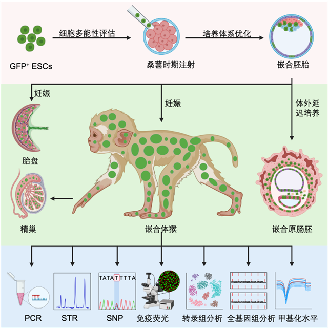 該工作建立了系統(tǒng)評估不同培養(yǎng)條件下猴胚胎干細(xì)胞的多能性狀態(tài)的研究體系,并探索得到有利于胚胎干細(xì)胞存活的胚胎嵌合體的培養(yǎng)條件,顯著提升了胚胎干細(xì)胞注入胚胎后的存活效率,最終得到了出生存活的高比例胚胎干細(xì)胞貢獻的嵌合體猴,證實了注入的猴胚胎干細(xì)胞可以高效地貢獻到包括胎盤和生殖細(xì)胞在內(nèi)的各種不同組織和細(xì)胞。該研究對于理解靈長類胚胎干細(xì)胞全能性和發(fā)育潛能具有重要意義,為建立基于猴胚胎干細(xì)胞嵌合體的基因打靶和模型構(gòu)建技術(shù)奠定了基礎(chǔ)。
