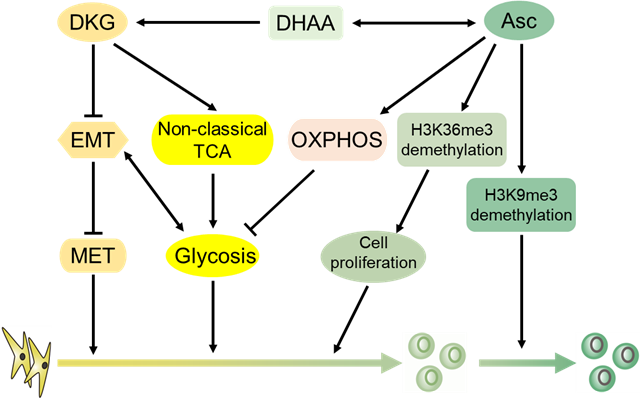 研究團(tuán)隊(duì)分別采用Vc及其代謝產(chǎn)物DHAA和DKG等處理體細(xì)胞重編程,發(fā)現(xiàn)Vc表現(xiàn)出通過DKG依賴途徑和非依賴途徑促進(jìn)重編程的雙重能力。一方面,Vc通過DKG非依賴的途徑促進(jìn)細(xì)胞增殖,并誘導(dǎo)pre- iPSCs向iPSCs轉(zhuǎn)化,從而促進(jìn)重編程。另一方面,Vc通過DKG依賴機(jī)制觸發(fā)間充質(zhì)-上皮轉(zhuǎn)化(MET)并激活糖酵解。值得注意的是,DKG激活了以增加琥珀酸、延胡索酸和蘋果酸為特征的非典型三羧酸循環(huán),促使細(xì)胞代謝從氧化磷酸化(OXPHOS)向糖酵解轉(zhuǎn)變。此外,由于其抗氧化能力,Vc抑制糖酵解,從而阻止糖酵解與上皮-間質(zhì)轉(zhuǎn)化(EMT)之間的正反饋,最終導(dǎo)致更高水平的MET。