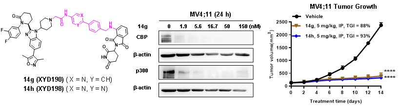 許永團(tuán)隊(duì)長(zhǎng)期致力于CBP/p300小分子抑制劑的研究,并獲得了系統(tǒng)性的研究成果(Eur.?J.?Med.?Chem.?2018;Acta Pharmacol.?Sin.?2019;J. Med. Chem.?2022;Bioorg. Chem.?2024)。然而,CBP/p300小分子抑制劑會(huì)面臨兩個(gè)問(wèn)題:(1)化合物長(zhǎng)期暴露會(huì)導(dǎo)致耐藥;(2)化合物單獨(dú)靶向CBP/p300的HAT或BRD域可能無(wú)法完全消除其功能。因此,迫切需要一種新的策略,以獲得更有效的治療。