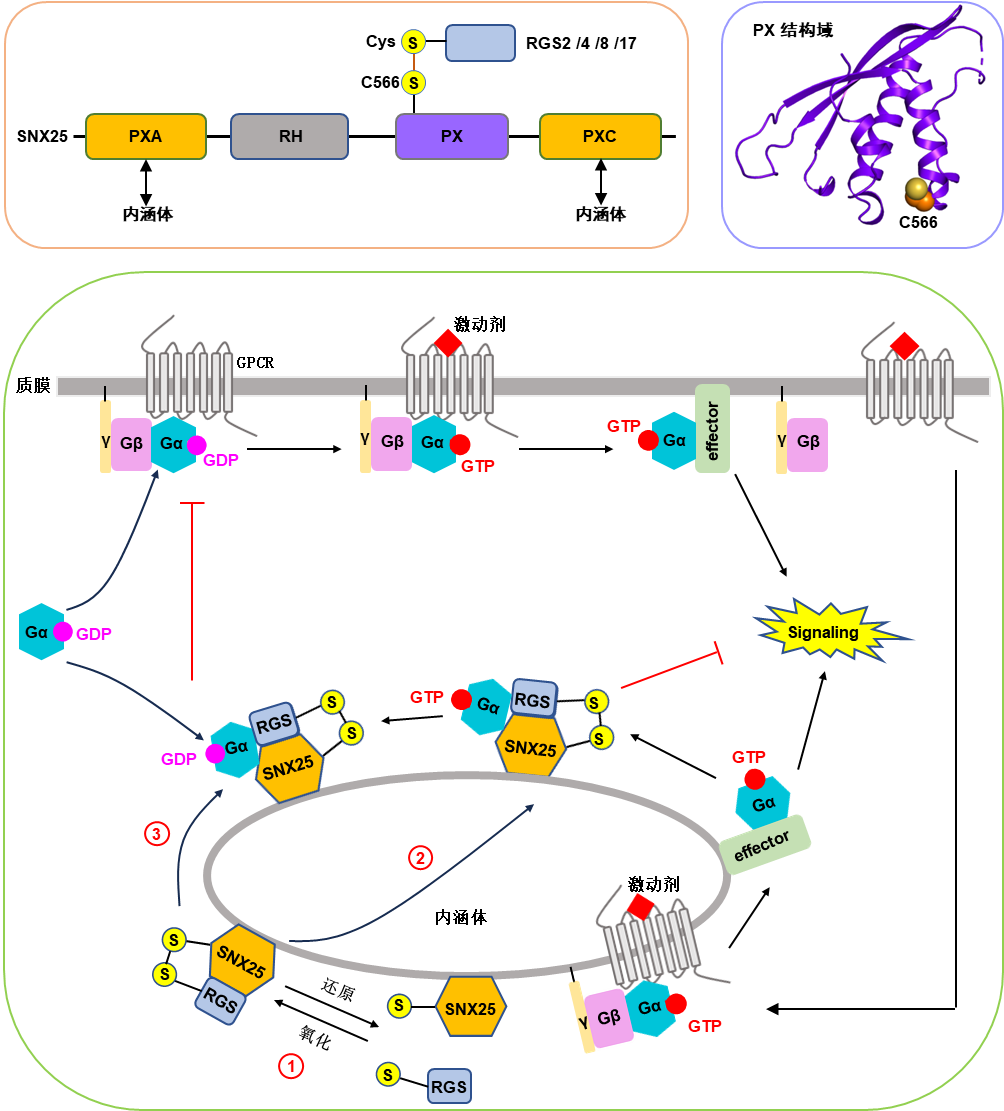 研究團隊利用免疫沉淀-質(zhì)譜聯(lián)用技術(shù)和熒光共定位等實驗方法,發(fā)現(xiàn)SNX25的PX結(jié)構(gòu)域能結(jié)合一些經(jīng)典的RGS蛋白,包括RGS2、RGS4、RGS8和RGS17。通過結(jié)構(gòu)生物學(xué)和細胞生物學(xué)實驗,研究團隊發(fā)現(xiàn)SNX25與RGS蛋白的相互作用主要依賴SNX25-PX結(jié)構(gòu)域中C566與RGS蛋白N端半胱氨酸形成的分子間二硫鍵,且該相互作用受氧化還原的調(diào)控。通過熒光共定位實驗,團隊進一步發(fā)現(xiàn)PXA和PXC結(jié)構(gòu)域可以介導(dǎo)SNX25靶向內(nèi)涵體。通過招募經(jīng)典RGS蛋白到內(nèi)涵體,SNX25可以促進內(nèi)涵體上Gαi/q蛋白的失活,最終抑制內(nèi)涵體上GPCR-Gi/q偶聯(lián)的信號轉(zhuǎn)導(dǎo)(圖1)。
