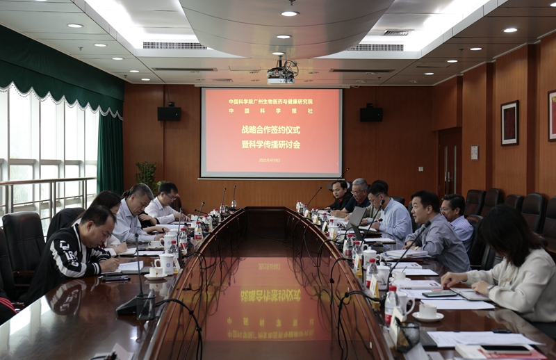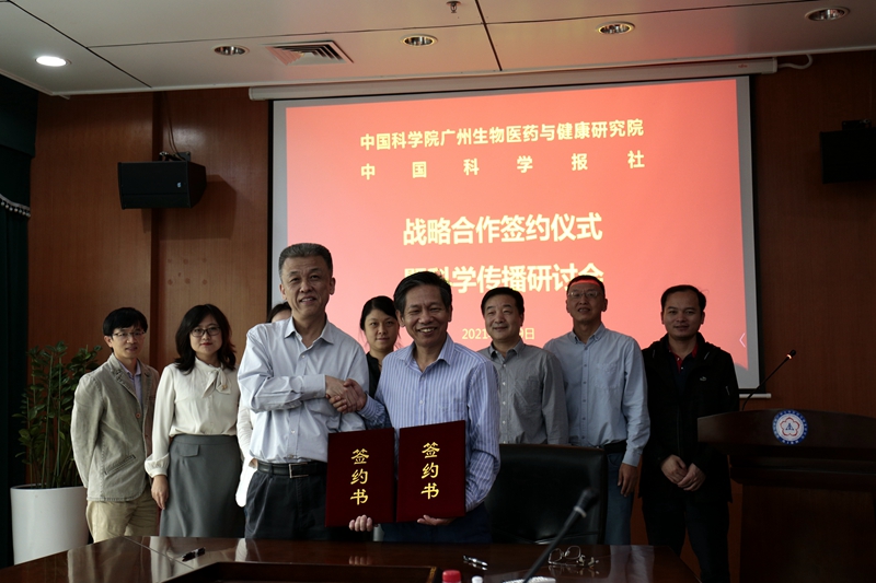 4月9日,中國科學(xué)院廣州生物醫(yī)藥與健康研究院(簡稱廣州健康院)與中國科學(xué)報社戰(zhàn)略合作協(xié)議簽約儀式暨科學(xué)傳播研討會在廣州健康院第一會議室舉行。廣州健康院院長陳新文、中國科學(xué)報社黨委書記劉峰松代表雙方簽訂協(xié)議。會議由廣州健康院黨委副書記、紀委書記侯紅明主持。