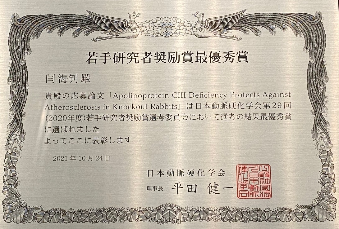 閆海釗博士畢業(yè)于日本山梨大學(xué),2020年5月入職我院賴(lài)良學(xué)研究員課題組開(kāi)展博士后研究,研究方向?yàn)槔没蚓庉嫾彝眉按髣?dòng)物疾病模型進(jìn)行脂質(zhì)代謝、高脂血癥、動(dòng)脈粥樣硬化、高血壓、誘導(dǎo)型斑塊破裂和心肌梗死等心血管疾病。本次閆海釗博士的獲獎(jiǎng)成果于2020年9月發(fā)表于動(dòng)脈硬化基礎(chǔ)研究領(lǐng)域權(quán)威期刊《ATVB》上,題目為“Apolipoprotein CIII Deficiency Protects Against Atherosclerosis in Knockout Rabbits”,日本山梨大學(xué)與中國(guó)科學(xué)院廣州生物醫(yī)藥與健康研究院為共第一單位。