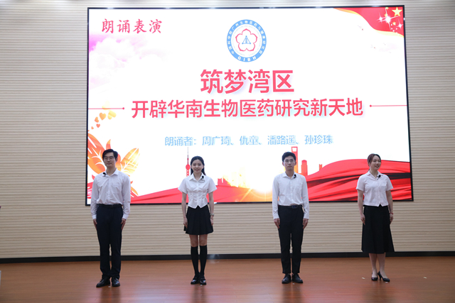 今年是廣州健康院建院20周年,在讀研究生周廣琦、仇童、潘路遙、孫珍珠四位同學(xué)獻(xiàn)上朗誦表演《筑夢灣區(qū),開辟華南生物醫(yī)藥研究新天地》,展現(xiàn)了廣州健康院人不忘初心,砥礪奮進(jìn),努力實(shí)現(xiàn)高水平科技自強(qiáng)自立的成長歷程和決心。