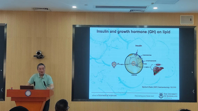 陳晨以“Academic Career in a Rapidly Changing World”為主題,結(jié)合他的教育經(jīng)歷、工作經(jīng)歷,講述其在代謝調(diào)節(jié)、生長激素、糖尿病、肥胖、內(nèi)分泌相關(guān)腫瘤等領(lǐng)域的研究和個人心得體會。此外,他還結(jié)合實驗案例,為在座學生講解飲食與激素、代謝、肥胖之間的關(guān)聯(lián),不同年齡、不同性別的代謝和生長激素的差異等。