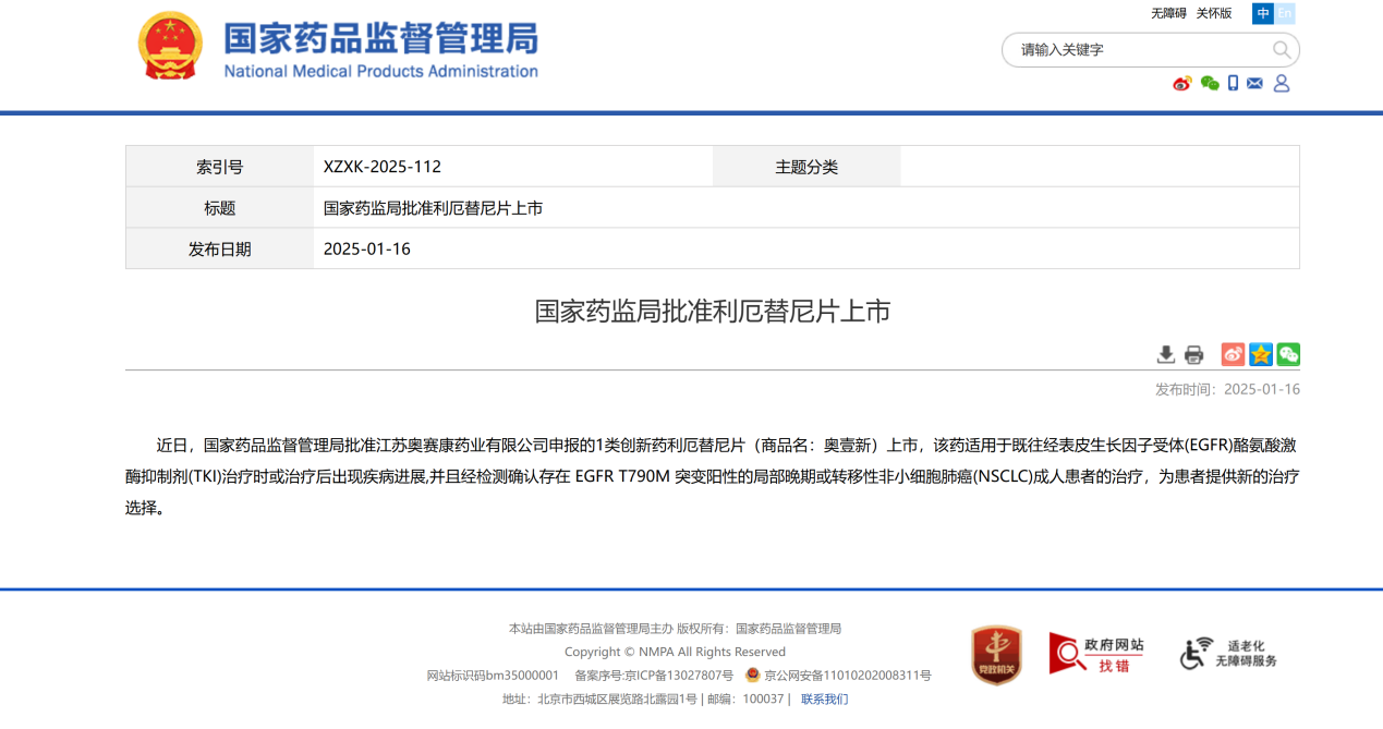 2025年1月16日,中國科學(xué)院上海藥物研究所、中國科學(xué)院廣州生物醫(yī)藥與健康研究院與江蘇奧賽康藥業(yè)有限公司聯(lián)合自主研發(fā)的1類創(chuàng)新藥利厄替尼片(商品名:奧壹新),正式獲得國家藥品監(jiān)督管理局(NMPA)的上市批準(zhǔn)。