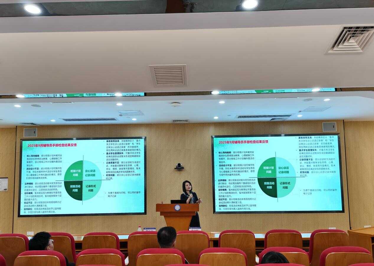 隨后,教育處負責(zé)人鄭小潔通報《輔導(dǎo)員工作手冊》核查情況,明確記錄規(guī)范并提出改進建議,分享學(xué)生思政及心理健康教育工作實用方法與技巧,切實推動學(xué)生管理與心理健康工作向標準化、精細化邁進。