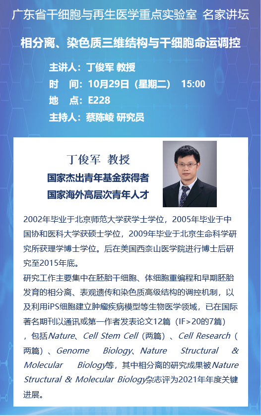 2024年10月29日廣東省干細胞與再生醫(yī)學重點實驗室名家講壇:相分離、染色質(zhì)三維結(jié)構與干細胞命運調(diào)控