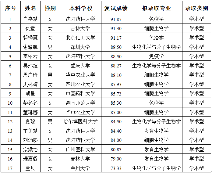 經(jīng)我院招生工作小組考核,2021年我院擬錄取推薦免試碩士(碩博連讀)研究生17名,其中碩博連讀研究生(學(xué)術(shù)型)17名?,F(xiàn)將名單公示如下: