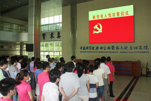 6月27日下午,中科院廣州生物醫(yī)藥與健康研究院藥物開發(fā)體系(DDP)黨支部在研究院大廳隆重舉行了新黨員入黨宣誓儀式。儀式由黨支部書記劉小蓉主持,院黨委書記黃建沖、黨支部全體黨員、全院入黨積極分子和其他團(tuán)隊黨支部黨員代表參加了儀式。