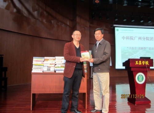 在贈(zèng)書儀式上,廣州分院黨群工作處處長(zhǎng)郭震代表分院團(tuán)委向玉泉學(xué)校贈(zèng)送了100多冊(cè)科普書籍。