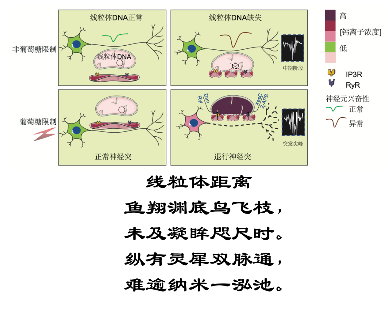 “世界上最遙遠(yuǎn)的距離,是飛鳥與魚的距離,一個(gè)翱翔天際,一個(gè)卻深潛海底”,世界上最遙遠(yuǎn)的距離不是飛鳥與魚的距離,是線粒體與內(nèi)質(zhì)網(wǎng)的距離。正是“魚翔淵底鳥飛枝,未及凝眸咫尺時(shí)”!內(nèi)質(zhì)網(wǎng)-線粒體接觸的距離20nm,通過兩個(gè)通道RyR、IP3R把鈣離子從內(nèi)質(zhì)網(wǎng)傳給線粒體,調(diào)控能量的產(chǎn)生;而接觸距離的異常縮短,使鈣轉(zhuǎn)運(yùn)失控過載驅(qū)動(dòng)神經(jīng)元退行,正是“縱有靈犀雙脈通,難逾納米一泓池”。 世界上最遠(yuǎn)的距離,是這樣向死而生的情非得已。