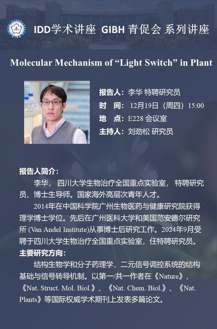 2024年12月19日IDD學(xué)術(shù)講座&GIBH青促會(huì)系列講座:Molecular Mechanism of “Light Switch” in Plant