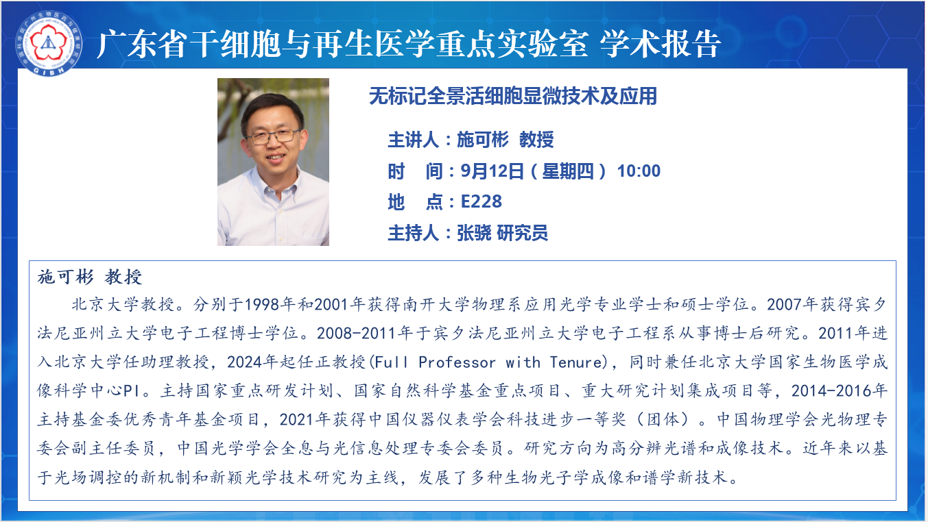 2024年9月12日廣東省干細(xì)胞與再生醫(yī)學(xué)重點(diǎn)實(shí)驗(yàn)室學(xué)術(shù)報(bào)告:無標(biāo)記全景活細(xì)胞顯微技術(shù)及應(yīng)用